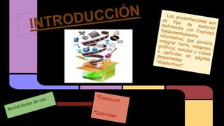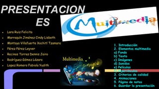 El documento detalla los aspectos esenciales para elaborar presentaciones multimedia efectivas, incluyendo elementos como texto, imágenes, sonido, y animaciones, así como la importancia de la planificación y los criterios de calidad. Se enfatiza la necesidad de complementariedad entre los diferentes elementos y la visibilidad de los contenidos. Además, se menciona cómo guardar y presentar la información en distintos formatos.