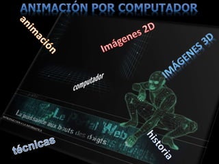 Este documento introduce conceptos clave relacionados con la informática y la animación. Explica que la animación es el proceso de tomar una serie de imágenes individuales y concatenarlas en secuencia para dar la impresión de movimiento continuo. También define la animación por computadora como la presentación de información digital en movimiento a través de una secuencia de imágenes creadas por computadora, utilizada principalmente en películas y videojuegos.