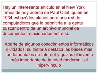 El documento describe el hipervínculo, incluyendo su historia e inventores. Explica que Ted Nelson acuñó el término "hipertexto" en 1965 para su proyecto Xanadu, y que Douglas Engelbart implementó por primera vez el uso práctico del hipervínculo en 1966 en el Sistema en Línea de Stanford. También resume cómo se usan los hipervínculos en presentaciones y en el aula para interactuar con estudiantes.