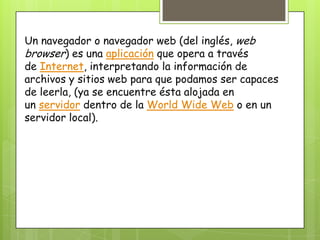Un navegador web es una aplicación que permite a los usuarios visualizar y navegar entre páginas web. Interpreta el código HTML de las páginas y las presenta en pantalla, permitiendo al usuario interactuar con su contenido y seguir enlaces hacia otras páginas. Los primeros navegadores solo soportaban una versión simple de HTML, pero los modernos siguen estándares como HTML y XHTML para mostrar las páginas de forma consistente.
