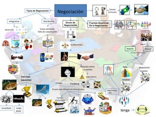 Este documento describe diferentes tipos y conceptos clave de la negociación, incluyendo tipos como la negociación integrativa y distributiva, zonas de negociación, fuerzas dinámicas, y causas comunes para la negociación. También discute conceptos como intereses, relaciones entre las partes, y fuentes institucionales que influyen en el proceso de negociación.
