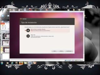 Ubuntu es una distribución Linux gratuita y de código abierto enfocada en ordenadores de escritorio. Se basa en Debian y se enfoca en facilidad de uso, libertad de uso y actualizaciones regulares cada 6 meses. Es patrocinada por Canonical Ltd. y ofrece soporte para instalación, características como Firefox y herramientas administrativas como Sudo. Requiere al menos 384MB de RAM y 3GB de espacio en disco para una instalación típica de 30 minutos.