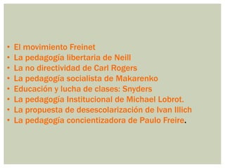 Este documento resume varias propuestas educativas del siglo XX como el movimiento Freinet, la pedagogía libertaria de Neill, la no directividad de Carl Rogers, la pedagogía socialista de Makarenko, la pedagogía de Snyders sobre educación y lucha de clases, la pedagogía institucional de Michael Lobrot, la propuesta de desescolarización de Ivan Illich, y la pedagogía concientizadora de Paulo Freire. Cada uno de estos movimientos o pedagogos propuso nuevos enfoques para la educ