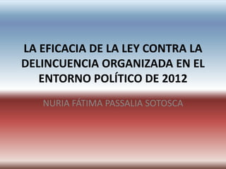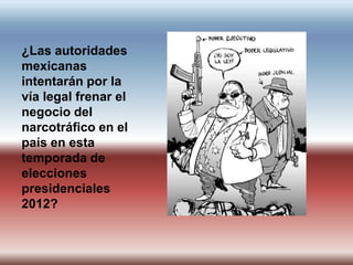 Este documento discute los esfuerzos del gobierno mexicano para frenar el negocio del narcotráfico antes de las elecciones presidenciales de 2012 a través de la aplicación de la ley contra la delincuencia organizada. Aunque el gobierno afirma que está trabajando para prevenir la influencia del narcotráfico en las elecciones, algunos candidatos podrían verse influenciados y las propuestas de los candidatos se centran en gran medida en el tema del narcotráfico, lo que sugiere que estas organizaciones podrían influir