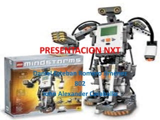 Este documento presenta el proyecto Lego Mindstorms NXT. Explica que los estudiantes pueden aprender ciencia, robótica y matemáticas de manera divertida y creativa a través de la construcción y programación de robots. Detalla los componentes del robot como el ladrillo NXT, sensores, motores y baterías, y cómo conectarlos. También cubre el software de programación y cómo cargar programas a través de Bluetooth o USB.