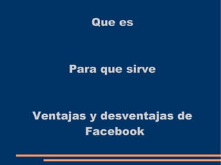 Facebook es la red social más utilizada actualmente con más de 1,550 millones de usuarios. Sirve para estar informado, buscar amigos, formar grupos y darse a conocer. Ofrece ventajas como compartir información con otros y dar a conocer empresas, pero también tiene desventajas como falta de privacidad y posible adicción.
