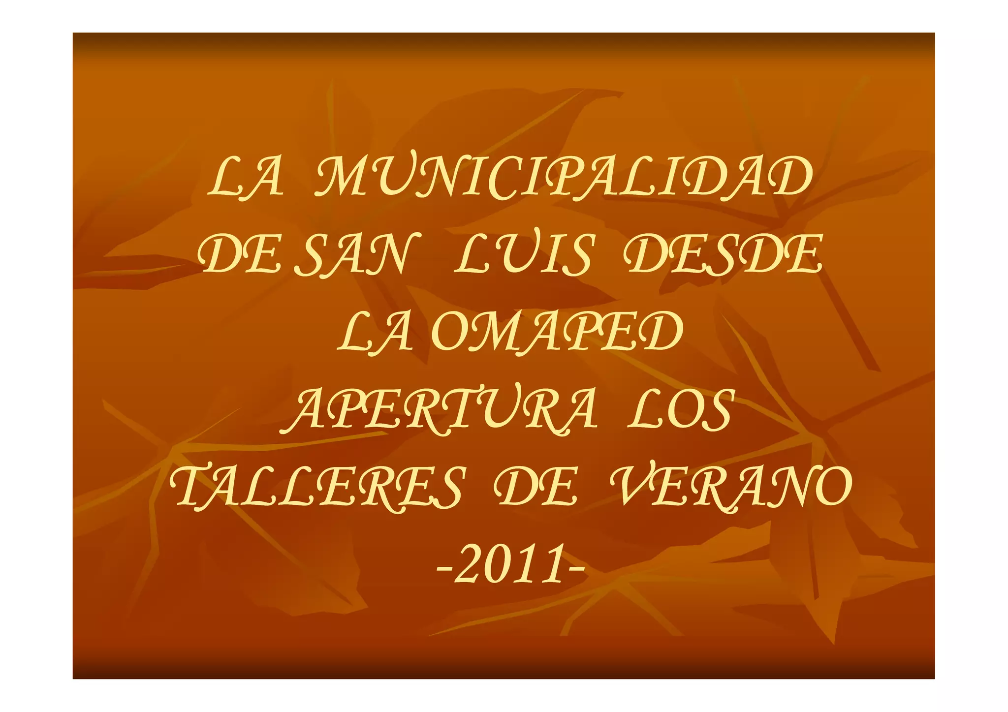 La Municipalidad de San Luis abrirá los talleres de verano 2011-2011 a través de la OMAPED. Los requisitos para inscribirse incluyen llenar una ficha de inscripción, incluir dos fotografías tamaño pasaporte a colores, una fotocopia del DNI y un certificado de discapacidad o diagnóstico médico. Las inscripciones son gratuitas y para más información se puede contactar a la psicóloga Elizabeth Caballero H. al teléfono 765-3959 o por correo electrónico a omapeds