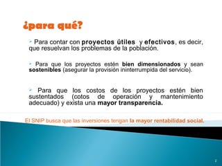 El SNIP es un sistema administrativo del Estado que certifica la calidad de los proyectos de inversión pública a través de principios y metodologías para garantizar un análisis técnico adecuado. Busca proyectos útiles y efectivos que resuelvan problemas de la población de manera sostenible y con costos debidamente sustentados para ofrecer la mayor rentabilidad social.