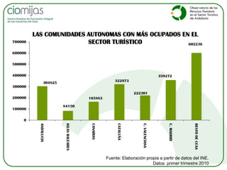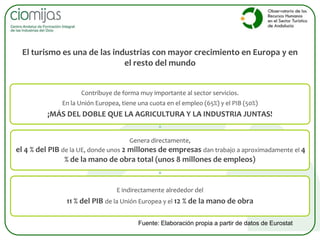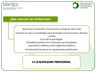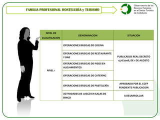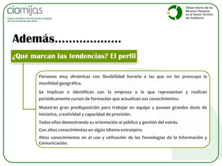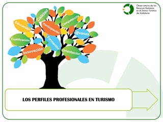 El documento describe las actividades del Observatorio de Recursos Humanos en el Sector Turístico de Andalucía. La misión del Observatorio es mejorar la competitividad del sector turístico andaluz mediante el estudio y análisis de los recursos humanos. El Observatorio ha realizado varios proyectos de investigación y análisis de la oferta y demanda de empleo en el sector turístico. Actualmente se encuentra desarrollando nuevos proyectos y colaborando con instituciones educativas para mejorar la formación en el sector turíst