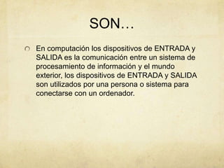 Los dispositivos de entrada permiten introducir datos a la computadora, como teclados y ratones, mientras que los dispositivos de salida, como monitores e impresoras, reciben información de la computadora. Algunos dispositivos pueden funcionar tanto para entrada como para salida, como discos duros y unidades USB. Los dispositivos de almacenamiento almacenan programas y datos de forma temporal o permanente.
