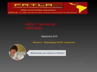 Este documento describe la importancia de la presencia, el alcance, la capacitación, la interacción y el aprendizaje electrónico (e-learning) en las aulas virtuales. Señala que es importante dar una imagen corporativa al aula virtual y establecer objetivos claros sobre lo que se realizará con los estudiantes. También enfatiza la necesidad de que los docentes se capaciten continuamente y usen recursos y actividades para generar interacción entre los estudiantes y guiarlos con amor y calidez.
