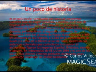 Palau es un país insular en el océano Pacífico compuesto por cerca de 340 islas. Fue controlado por España, Gran Bretaña, Alemania y Japón antes de independizarse de los Estados Unidos en 1994. Durante la Segunda Guerra Mundial, las islas fueron el escenario de importantes batallas entre Estados Unidos y Japón. Desde 1947, Palaos estuvo bajo la administración de Estados Unidos como parte de un territorio fiduciario de Naciones Unidas.