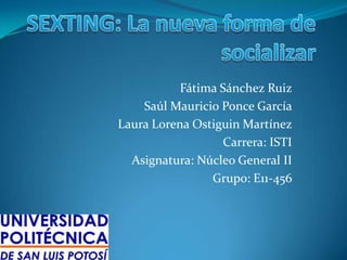 El documento trata sobre el sexting, que es la nueva forma de socializar entre adolescentes y jóvenes de 13 a 18 años. El objetivo es comprender por qué los jóvenes exhiben su cuerpo en las redes sociales y hacer un mal uso de la tecnología. La investigación será cualitativa y cuantitativa para analizar las causas y consecuencias del sexting en los jóvenes.