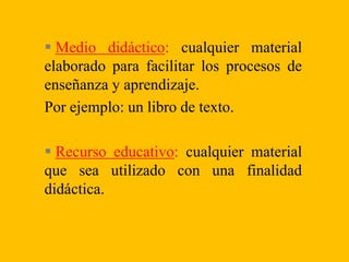 El documento describe los medios didácticos y recursos educativos, señalando que son cualquier material utilizado con una finalidad educativa. Explica que los medios didácticos tienen componentes como el sistema de símbolos, contenido y plataforma tecnológica, y cumplen funciones como proporcionar información, guiar aprendizajes y motivar a los estudiantes. Además, detalla diferentes tipos de recursos didácticos como materiales impresos, audiovisuales y nuevas tecnologías.