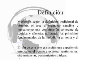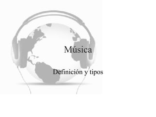 Este documento define la música como el arte de organizar sonidos y silencios de manera coherente usando melodía, armonía y ritmo para crear una experiencia estética en el oyente y expresar sentimientos. Luego describe brevemente algunos géneros musicales como rock and roll, pop, rap y jazz, señalando sus orígenes y características principales. Finalmente, concluye que la música puede ser disfrutada en todo el mundo.