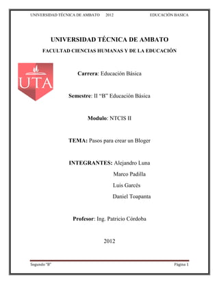El documento describe los pasos para crear un blog usando Blogger. Explica cómo crear una cuenta de Google, seguir los pasos en la página de Blogger, elegir un nombre y plantilla para el blog, agregar publicaciones de texto e imágenes, y personalizar la apariencia y contenido del blog.