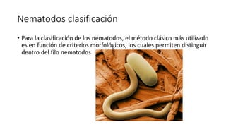 El documento resume la clasificación, morfología, ciclo de vida y otros aspectos de varios géneros de nematodos y acantocéfalos parásitos. Describe la clasificación de los nematodos en diferentes clases y subclases, así como los géneros más comunes como Ascaris, Trichuris, Strongyloides y sus características. Explica que los nematodos pueden tener ciclos de vida directos o indirectos, y que se reproducen sexual o asexualmente. También resume brevemente la clasificación, reproducción, alimentación y