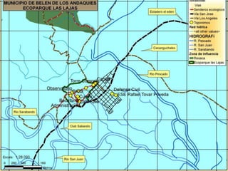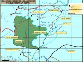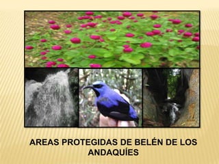 Este documento lista y describe 10 áreas protegidas establecidas en el municipio de Belén de los Andaquíes, Caquetá, Colombia. Incluye información sobre la fecha de creación, ubicación y extensión de cada área. También describe dos programas municipales: uno de seguridad alimentaria que promueve el cultivo y consumo de hortalizas, frutas y plantas medicinales para 170 familias, y otro de educación ambiental que involucra a niños en la creación de materiales educativos y ecoturismo.