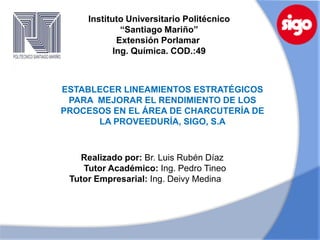 El documento detalla un informe de pasantía del Instituto Universitario Politécnico 'Santiago Mariño' en el área de charcutería de la empresa Sigo, S.A. A lo largo de las actividades desarrolladas, se realizaron diagnósticos y propuestas de mejora en procesos, así como la recopilación de información y formación profesional del pasante. Se presentan conclusiones y recomendaciones para optimizar tanto la enseñanza institucional como el funcionamiento del departamento.