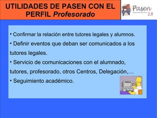 PASEN es un módulo de comunicación de la Comunidad Educativa que permite a padres, alumnos, directivos y profesores comunicarse. Ofrece utilidades como confirmar la relación entre tutores y alumnos, definir eventos comunicables, seguimiento académico del alumnado, cuaderno del profesorado, y comunicación de faltas de asistencia.