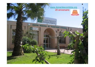 El documento celebra el 20 aniversario del área de promoción de donación de sangre en Córdoba, destacando la importancia de la donación altruista y anónima. Se presentan estadísticas sobre la cantidad de donaciones y la distribución geográfica, así como un historial de donantes y campañas de concienciación. Además, se esbozan planes futuros para la programación y ejecución de nuevas campañas de donación.