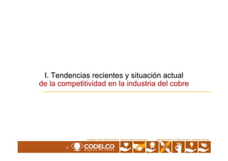 Este documento resume la situación actual y las tendencias recientes de la competitividad de la industria minera del cobre en Chile. Señala que los costos de producción de la industria han aumentado constantemente, mientras que la ley del mineral ha disminuido. Como resultado, una mayor proporción de la producción mundial de cobre ahora tiene menores costos que la producción chilena. El documento identifica áreas clave de preocupación para la competitividad de Chile, incluidos los altos costos de energía y la necesidad de mejorar la productividad en pro