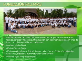 La Fundación Fautapo es una organización sin fines de lucro fundada en 2003 en Tarija, Bolivia, que busca mejorar la empleabilidad en el departamento. Tiene oficinas en varias ciudades y 160 empleados. El proyecto de empleabilidad registrará trabajadores, empleadores y ofertas de trabajo en un sistema en línea para facilitar el mercado laboral.