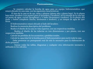 Planteamientos: Se requiere calcular la bomba de agua para un equipo hidroneumático, que estará ubicado en una casa, con las siguientes características: · El área de la casa es de 190, tiene 2 plantas (planta alta y planta baja). En la planta baja tiene: lavadero (con puntos para el lavandero y lavadora), en la entrada de la casa hay un punto de agua, cocina (lavaplatos) y ½ baño (lavamanos e inodoro). En la planta alta tiene: 2 baños completos (ducha, lavamanos e inodoro), y un tanque de agua de 1500 litros. · El hidroneumático estará ubicado al lado del lavadero. · Realizar la memoria descriptiva del problema. · Realice el diseño de la casa en vista superior, con sus respectivas medidas. · Realice el diseño de las tuberías en tres dimensiones y por planta, con sus respectivas medidas. · Calcule las pérdidas de los accesorios y pérdidas totales. · Calcule la capacidad de la bomba para el hidroneumático para surtir toda la casa. · Debe presentar un presupuesto real de tolo lo necesario para la elaboración de dicho proyecto. · Anexar todas las tablas, diagramas y cualquier otra información necesaria y utilizada en los cálculos.