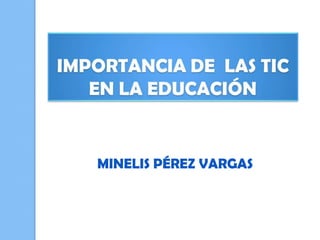 El documento de Minelis Pérez Vargas destaca la importancia de las tecnologías de la información y la comunicación (TIC) en el proceso educativo. Resalta la diversidad de recursos que facilitan la enseñanza y fomentan la creatividad y la innovación en los estudiantes. Además, enfatiza cómo las TIC contribuyen al fortalecimiento del aprendizaje y la generación de nuevos conocimientos.
