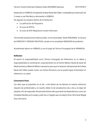 Este documento presenta la biografía del Técnico Tercero Enfermero Roberto Carlos Navarro Espinoza. Detalla su educación y experiencia laboral dentro de la Marina de Guerra del Perú, incluyendo su rol actual como encargado de la farmacia en el Hospital de la Base Naval del Callao. También resalta la importancia de la actualización continua de los profesionales para responder eficazmente a los retos diarios dentro de la institución.