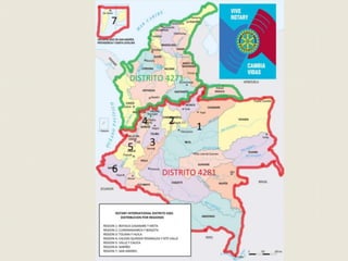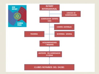 Este documento presenta los comités distritales y objetivos del Distrito 4281 de Rotary para el año 2013-2014 bajo el liderazgo del gobernador electo Pedro Mejía Sandoval. Describe 13 comités distritales y sus respectivos subcomités enfocados en áreas como planificación, capacitación, Fundación Rotaria, conferencia anual y servicios a la comunidad. Además, establece 3 objetivos principales: que los clubes sean dinámicos, que aporten el 100% al programa CADA ROTARIO CADA AÑ