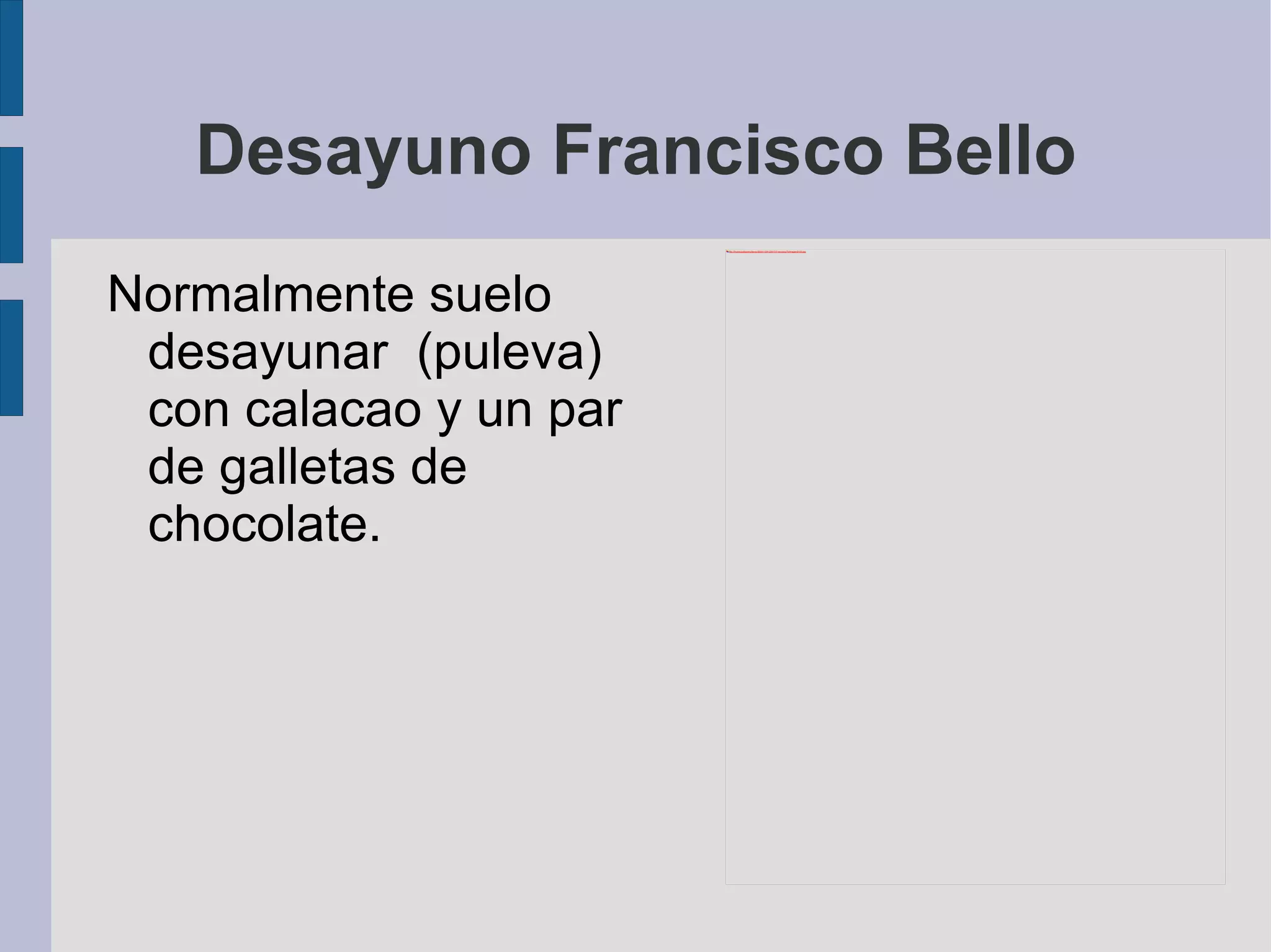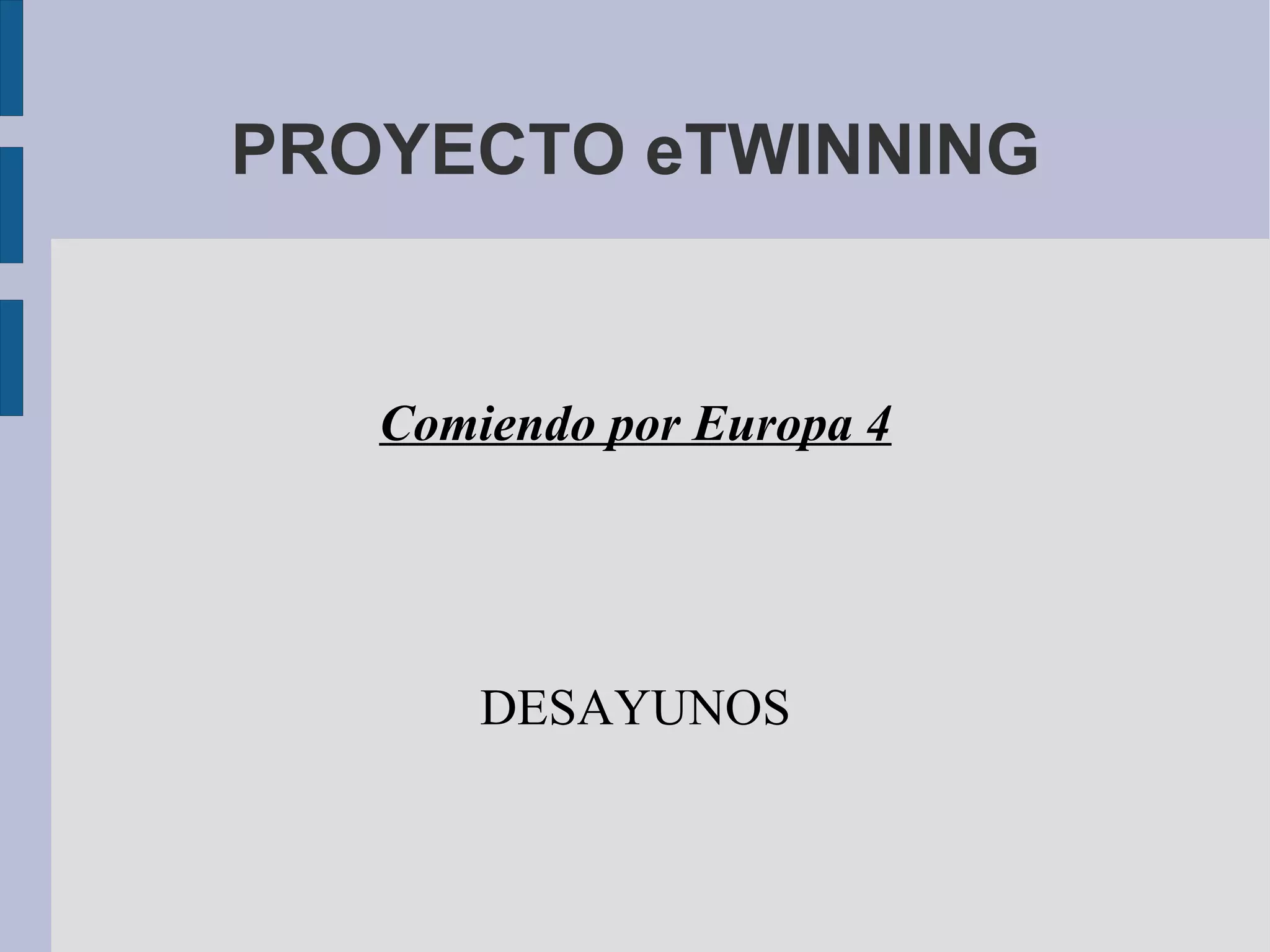 El documento describe los desayunos típicos y las cocinas de varios estudiantes de diferentes países europeos. Francisco de España desayuna galletas con cacao y calacao. Ana de Portugal come galletas de chocolate, yogur o leche con pan y queso o bollos con leche y chocolate. Tamara de España come pan con manteca y leche solo o con cacao. Chakib de Bulgaria come pasteles y zumo de naranja. Vesilin no especifica su desayuno. Se incluyen fotos de las cocinas mostrando electrodomésticos y almacenamiento