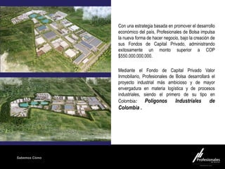 Este documento proporciona información sobre un fondo de capital privado valor inmobiliario que desarrollará un proyecto industrial llamado Polígonos Industriales de Colombia (PIC) en Cartagena. El PIC consta de 394 hectáreas que serán transformadas en zonas industriales, logísticas y comerciales. El fondo tiene una inversión total de $238.000 millones y una duración de 10 años, con beneficios tributarios para las empresas ubicadas en el PIC.