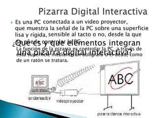 Una pizarra digital interactiva consiste en una PC conectada a un proyector que muestra la señal de la PC sobre una superficie lisa y rígida que permite controlar la PC mediante un bolígrafo u otro dispositivo táctil de forma similar a un ratón. Existen varios tipos como pizarras portátiles o tabletas que permiten escribir directamente sobre la superficie o proyectar presentaciones en salas grandes.