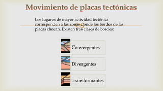 La teoría de placas tectónicas establece que la corteza terrestre está dividida en placas que se mueven continuamente sobre el manto. Existen tres tipos de bordes de placas: convergentes, donde las placas chocan; divergentes, donde las placas se separan; y transformantes, donde las placas se deslizan paralelamente.