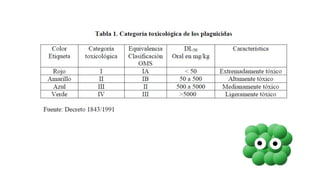 El documento describe diferentes tipos de plaguicidas, incluyendo sus características y efectos. Menciona plaguicidas clorados, organofosforados, carbamatos y piretroides, señalando que muchos han sido prohibidos debido a su toxicidad y efectos ambientales negativos. También resalta la importancia de usar plaguicidas de manera responsable para evitar la resistencia de plagas y daños a la salud y el medio ambiente.