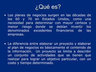El documento presenta una guía sobre cómo elaborar un plan de negocios efectivo. Explica que un plan de negocios es un documento que reúne toda la información necesaria para evaluar un negocio y sus lineamientos para ponerlo en marcha. Además, detalla las 8 secciones clave que debe contener un plan de negocios, incluyendo la descripción del negocio, el análisis de mercado, la planificación financiera, el plan de implementación y un plan de contingencia. El objetivo final es demostrar la viabilidad y rentabilidad del
