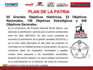 El documento presenta el Plan de la Patria 2013-2019 de Venezuela. Describe los 5 Grandes Objetivos Históricos, entre los que se encuentra el primero: "Defender, expandir y consolidar la independencia nacional". Este objetivo incluye 6 objetivos nacionales, 42 objetivos estratégicos y 101 objetivos generales enfocados en garantizar la continuidad de la revolución bolivariana, preservar la soberanía sobre los recursos naturales como el petróleo, garantizar el manejo soberano de los ingresos nacionales, lograr la soberanía