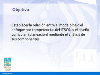 El documento presenta la introducción a un enfoque de competencias profesionales en el Instituto Tecnológico de Sonora. Describe el modelo de competencias del ITSON y cómo se relaciona con el diseño curricular. Incluye definiciones de competencia profesional y explica que el modelo evalúa los conocimientos, habilidades, actitudes y valores de los estudiantes. También describe los roles del docente y el alumno, así como estrategias pedagógicas para aplicar el modelo de competencias.