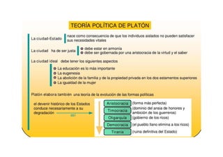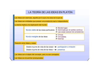 El documento presenta un resumen de las principales etapas de la filosofía griega y una biografía de Platón. Las etapas de la filosofía griega incluyen la etapa cosmologica de los presocráticos, la etapa antropológica de los sofistas y Sócrates, la etapa ontológica de Platón y Aristóteles, y la etapa ética de los estoicos y Aristóteles. La biografía de Platón describe su nacimiento en Atenas, su educación con Sócrates, sus viajes