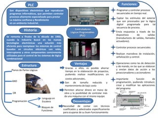 Los controladores lógicos programables (PLC) permiten programar y controlar procesos secuenciales en tiempo real captando estímulos externos y enviando respuestas a través de dispositivos de salida. Los PLC se remontan a finales de los 1960s cuando se buscó una solución más eficiente que los sistemas de control basados en relés. Los PLC tienen un tamaño reducido, bajo costo de mantenimiento y permiten controlar múltiples máquinas con un solo equipo.
