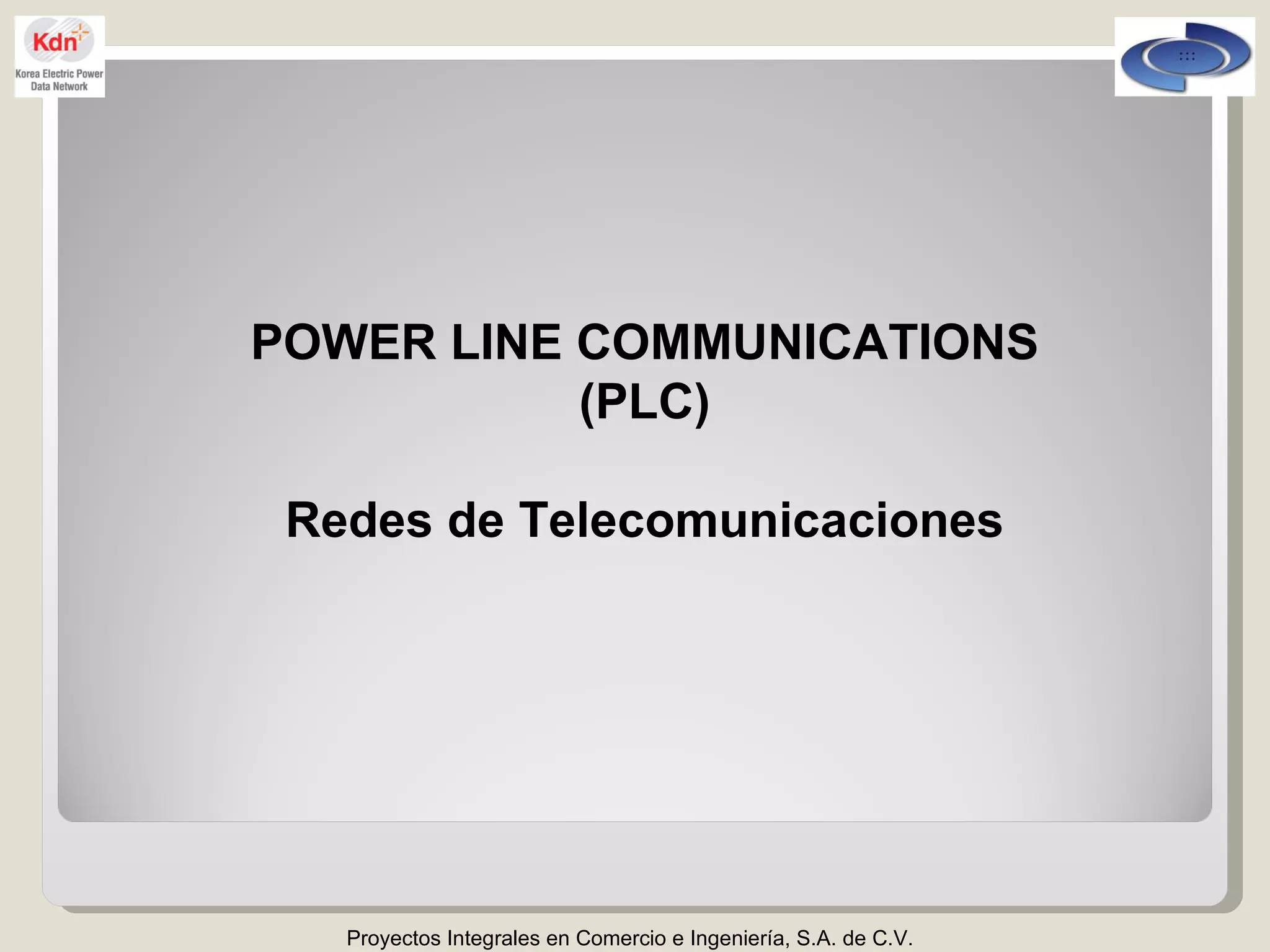 El documento describe la tecnología de comunicaciones por línea eléctrica (PLC), la cual permite transmitir señales de voz, datos y video a través de la red eléctrica existente. El PLC ofrece una alternativa de bajo costo a otras soluciones de telecomunicaciones, ya que no requiere instalaciones especiales y aprovecha la infraestructura eléctrica. El PLC soporta anchos de banda de hasta 200 Mbps y permite conectar dispositivos a cualquier toma de corriente de una vivienda o edificio.