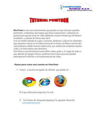 Este documento presenta un tutorial sobre cómo crear una cuenta y videos en la herramienta PowToon en 12 pasos. PowToon permite crear presentaciones dinámicas de forma gratuita y en línea con diversas herramientas fáciles de usar. El tutorial explica cómo registrarse en la página web de PowToon y cómo utilizar las funciones básicas para editar y guardar presentaciones.