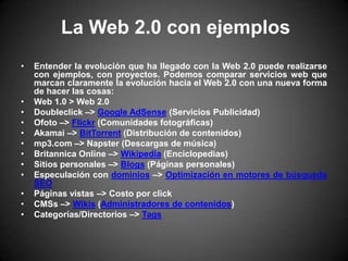 La Web 2.0 se refiere a la evolución de las aplicaciones tradicionales a aplicaciones web enfocadas en el usuario final, que fomentan la colaboración y comparten contenidos entre usuarios. Algunos ejemplos clave son wikis, blogs, redes sociales y servicios como Flickr y YouTube.