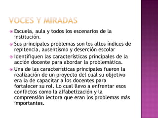 El documento describe los problemas de una escuela como altos índices de repitencia, ausentismo y deserción escolar. Un proyecto capacitó a los docentes para abordar estos problemas mediante el fortalecimiento de su rol, enfocándose en problemas como la alfabetización y comprensión lectora. La implementación de cambios positivos mejoró la comunicación entre docentes, familias y otras instituciones.