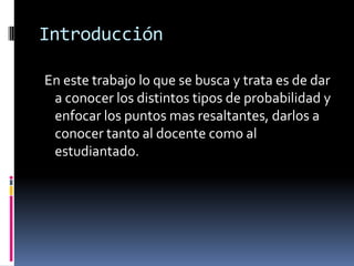 Este documento presenta información sobre diferentes tipos de distribuciones de probabilidad como la distribución de Poisson, binomial, geométrica, t-student y exponencial. Explica conceptos clave como media, varianza y desviación estándar. También proporciona detalles históricos sobre creadores de estas distribuciones como Jakob Bernoulli y cómo se aplican estos conceptos estadísticos.