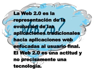 La Web 2.0es la representación de la evolución de las aplicaciones tradicionales hacia aplicaciones web enfocadas al usuario final. El Web 2.0 es una actitud y no precisamente una tecnología.