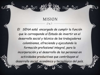 El documento presenta la misión, visión, símbolos y principios del SENA (Servicio Nacional de Aprendizaje). Su misión es ofrecer formación profesional para contribuir al desarrollo del país. Su visión para 2020 es ser una entidad líder en formación e innovación para aumentar la competitividad de Colombia. El escudo y la bandera representan los tres sectores económicos en los que actúa el SENA.