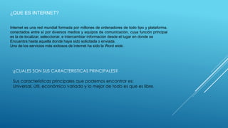 Internet es una red mundial formada por millones de ordenadores conectados entre sí que permite localizar e intercambiar información de forma universal, económica y variada. Los servicios más exitosos de internet incluyen el correo electrónico y la World Wide Web. Para conectarse a internet se necesita un terminal como un ordenador, tableta o teléfono inteligente conectado a través de un modem o banda ancha.