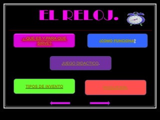 El documento describe la historia y funcionamiento de los relojes. Explica que los relojes sirven para medir el tiempo y su precisión depende de la base de tiempo programada. Detalla que los primeros relojes usaban el movimiento del sol o la luna, y cómo los relojes modernos usan un muelle o resorte y engranes para hacer girar las manecillas. También resume los diferentes tipos de relojes a través de la historia y cómo se han vuelto más precisos con el avance de la ciencia y tecnología.